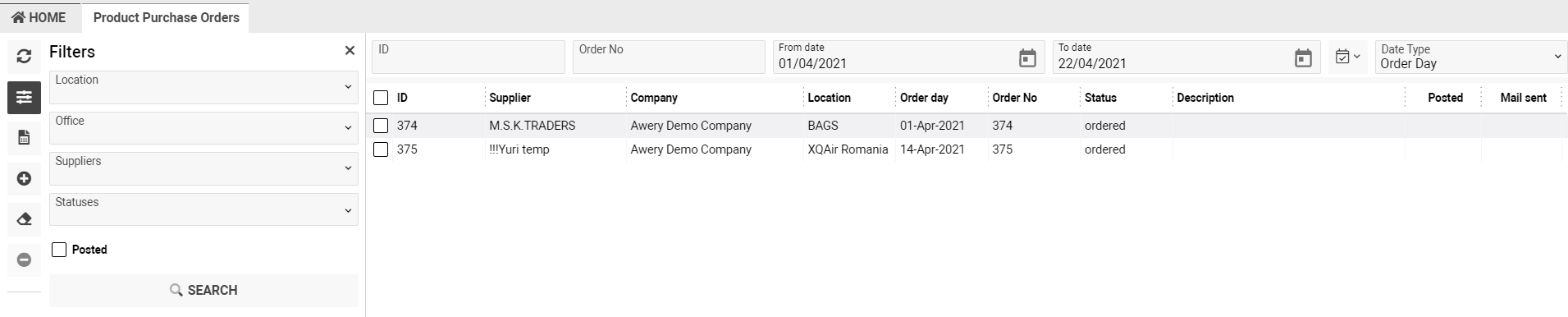 - The Location, Office, Suppliers, Statuses, Date Type selectors