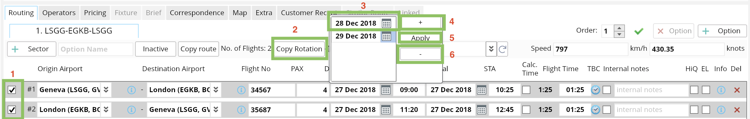 This feature allows to build the route as sequence of the same flight(s) avoiding entering the same information for several times. Instead, you can Copy Rotation following next steps: