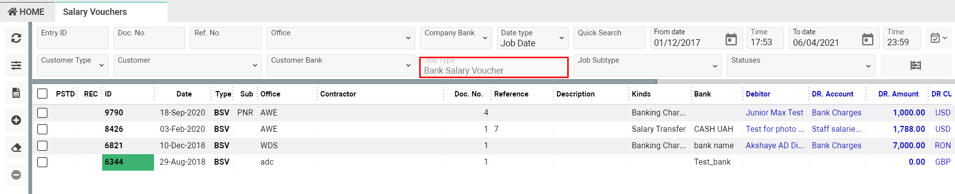 The Salary Vouchers page displays the lob list filtered by job type "Bank Salary Vouchers"