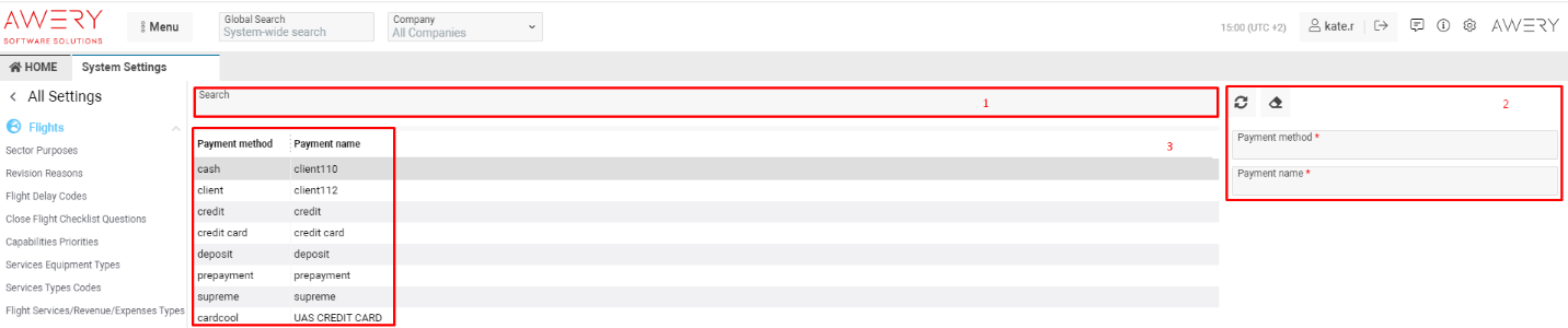 Navigate to the Settings section and under the System Setup Section click the “System Settings” Button. Then under the Flights Section click the “Services Payment Types" button.