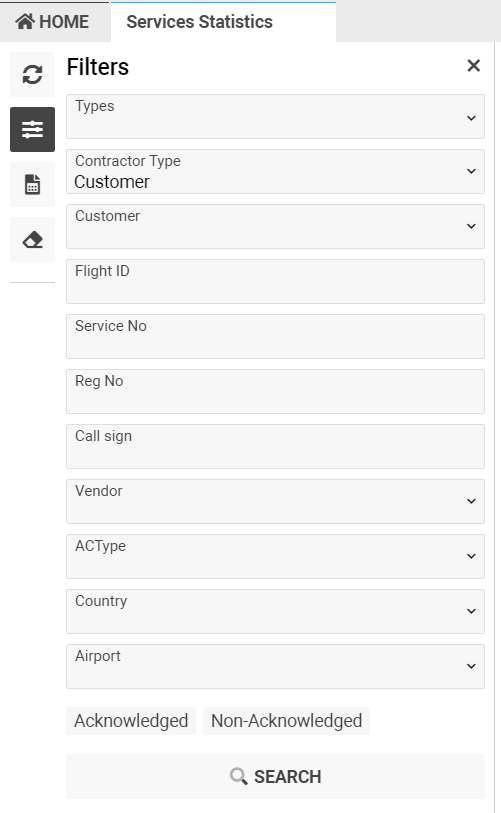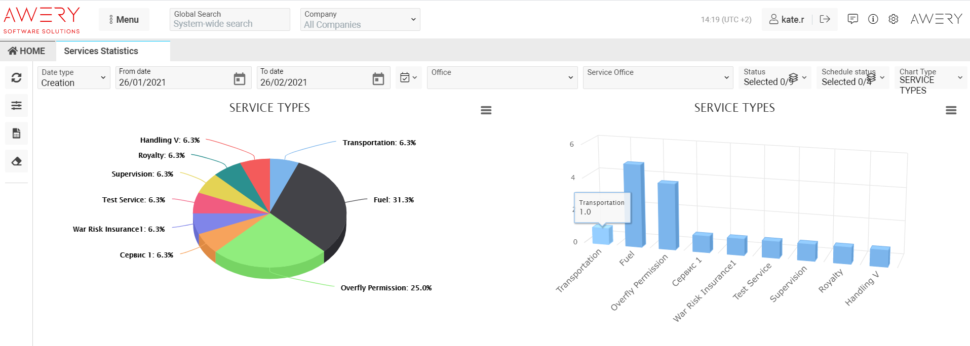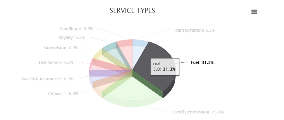 On the page you can see the data by a service type, airports, countries, customers, suppliers and filters by this data.