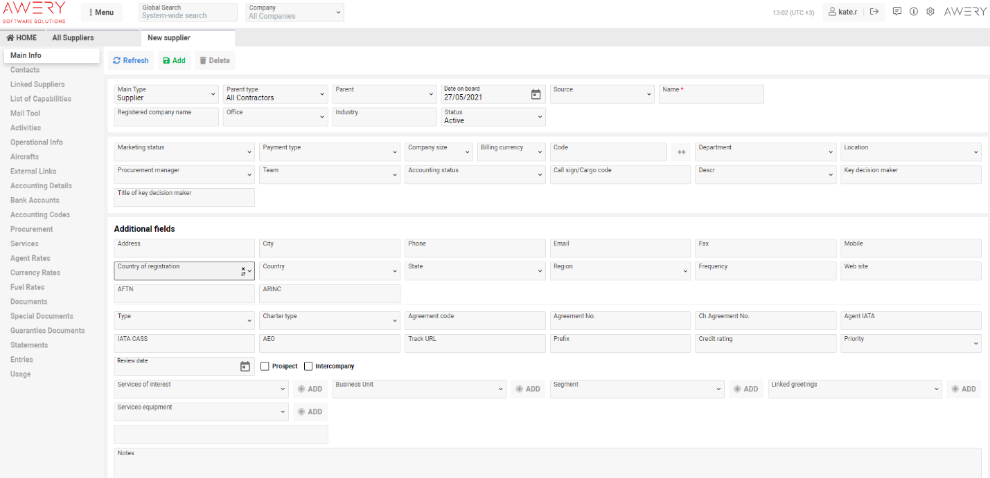 Name, Registered company name, CODE, Call sign/Cargo code, Key decision maker info.