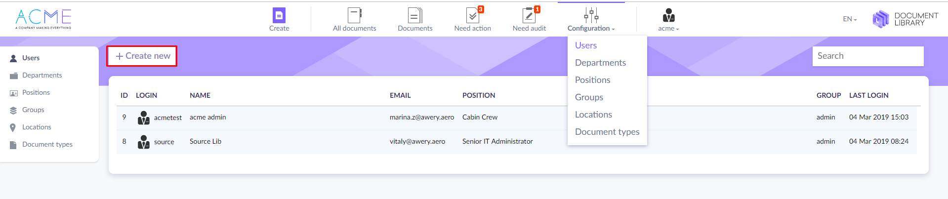 To create a new user click Configuration > Users > Create New