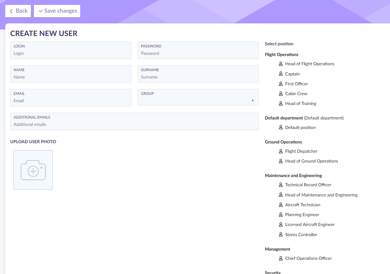 On the User creating page add login and password, name, surname, email, additional email, group, upload the photo and select position which this use is occupying. After adding all data, press "Save changes".
