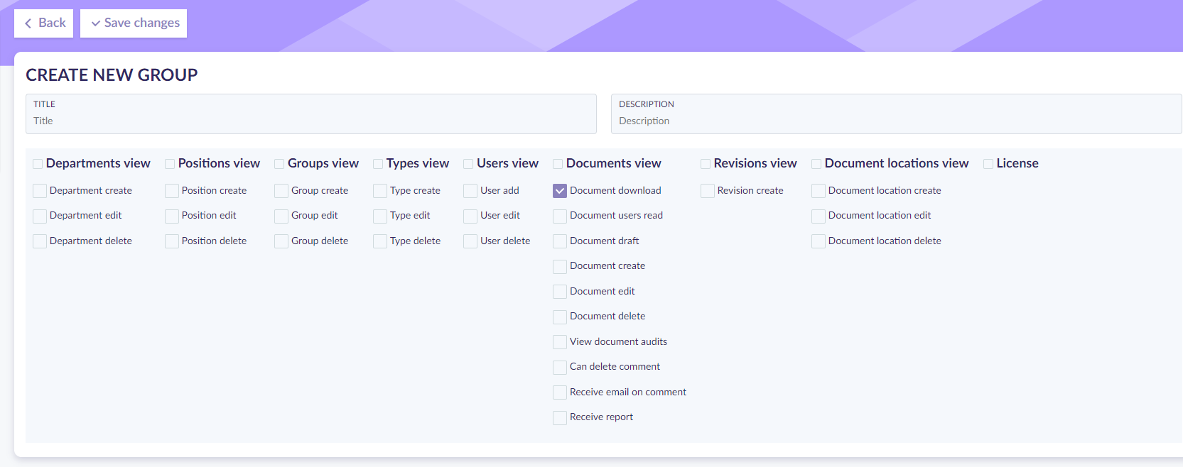 To create a new group add Title and description, chose permissions for the group. Please note, that some permissions are connected, when you chose one - connected will be chosen automatically, you can unclick any of them at any time.