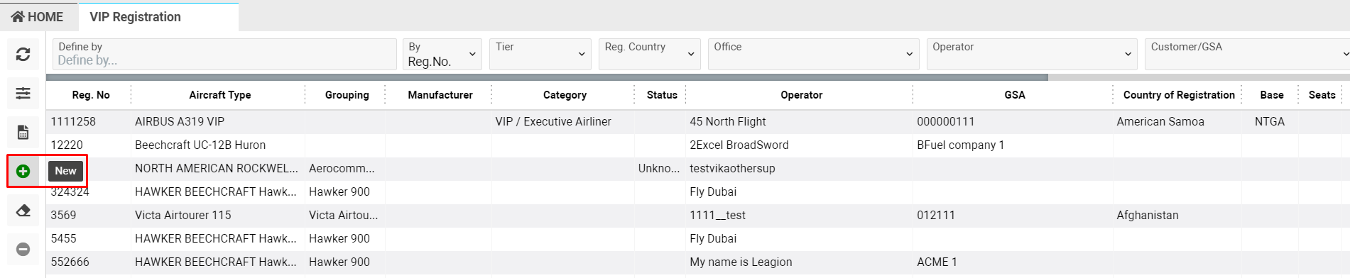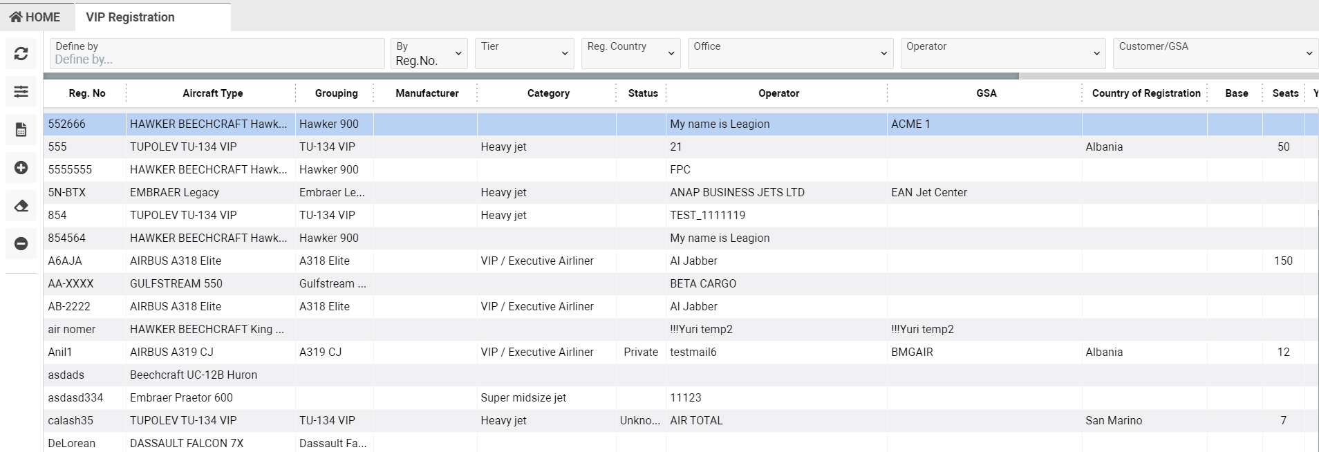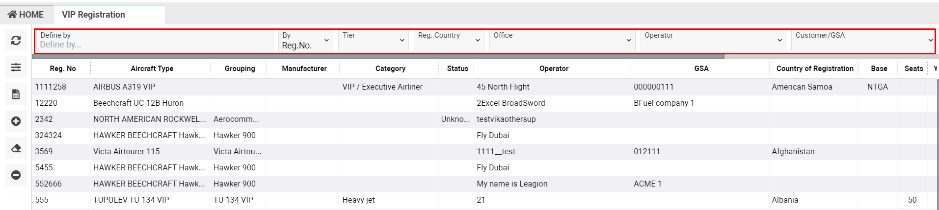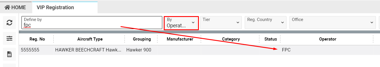 Home→Flights module→Aircraft section→VIP Registration