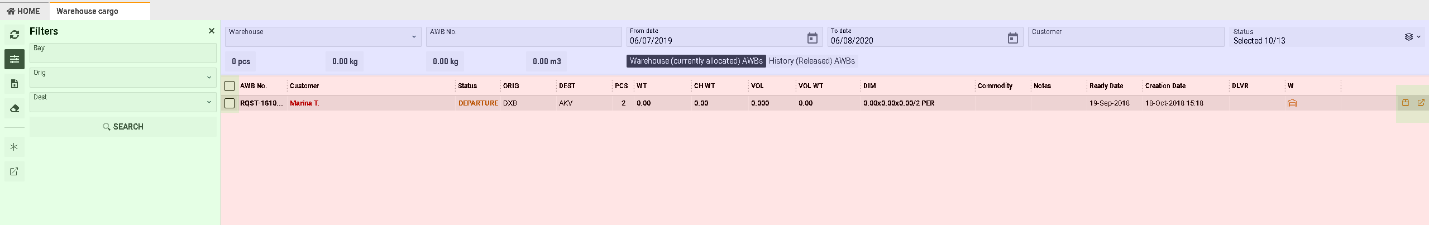 W Icon : Indicates if the AWB has a warehouse associated with it.