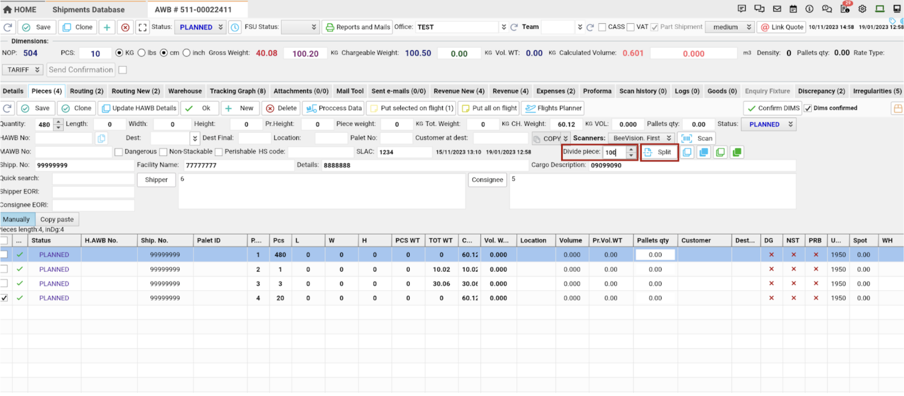 Splitting the shipment - is the process of dividing AWB pieces into separate units for further operation of these parts, namely: their removal from the flight, assignment to another flight, make changes to parts, removal from the system, etc.