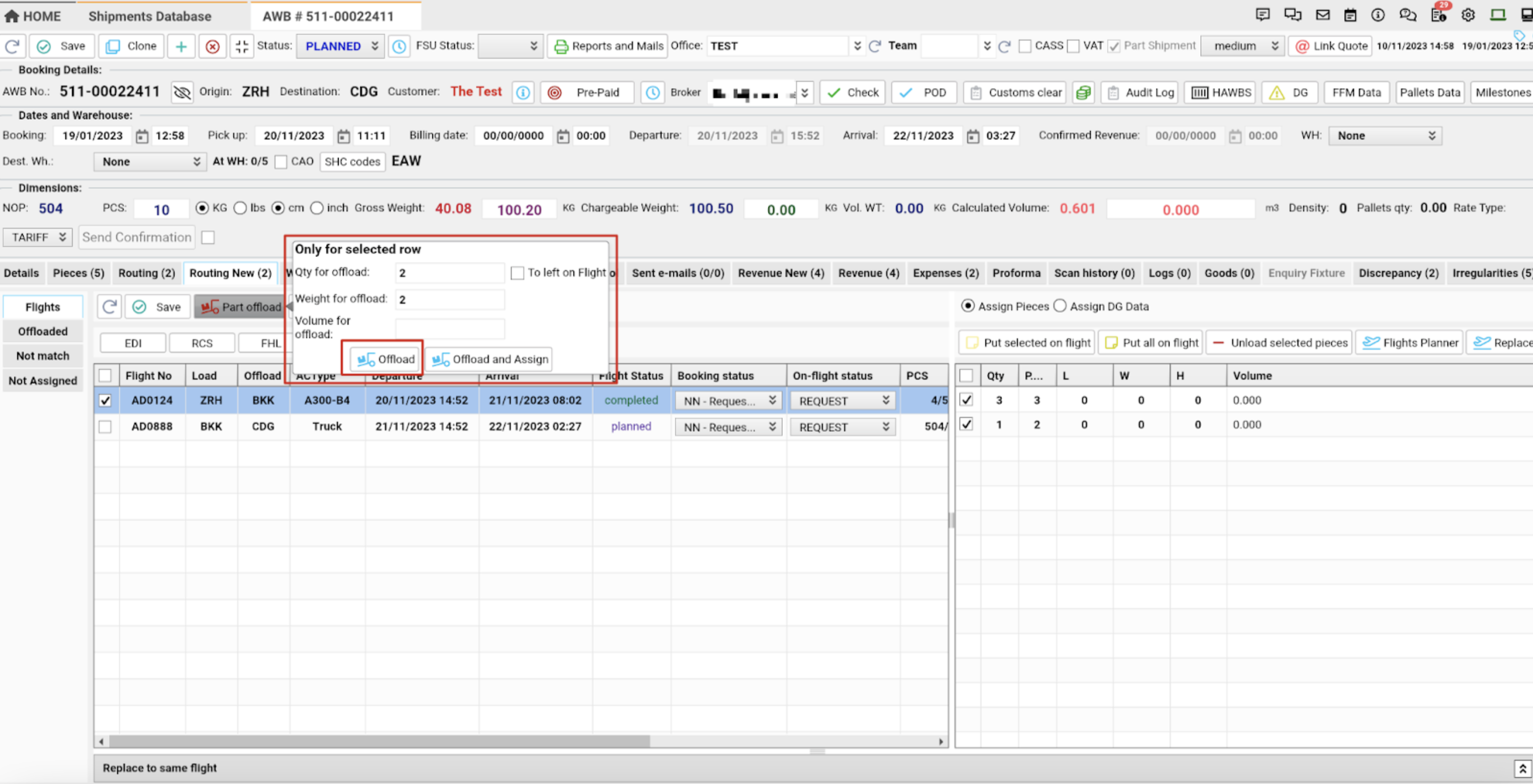 After performing the Part offloaded operation, you can further operate with the offloaded pieces (change parts, assign them to other flights, delete them from the system, etc.), for example, from the Pieces tab, where the offloaded pieces will be displayed with the off-loaded status. In the Routing tab, all unloaded items will also be displayed with the Offloaded mark. If you click Offloaded and assign instead of Offload, you will be able to schedule the separated pieces to another flight in the flight planner.