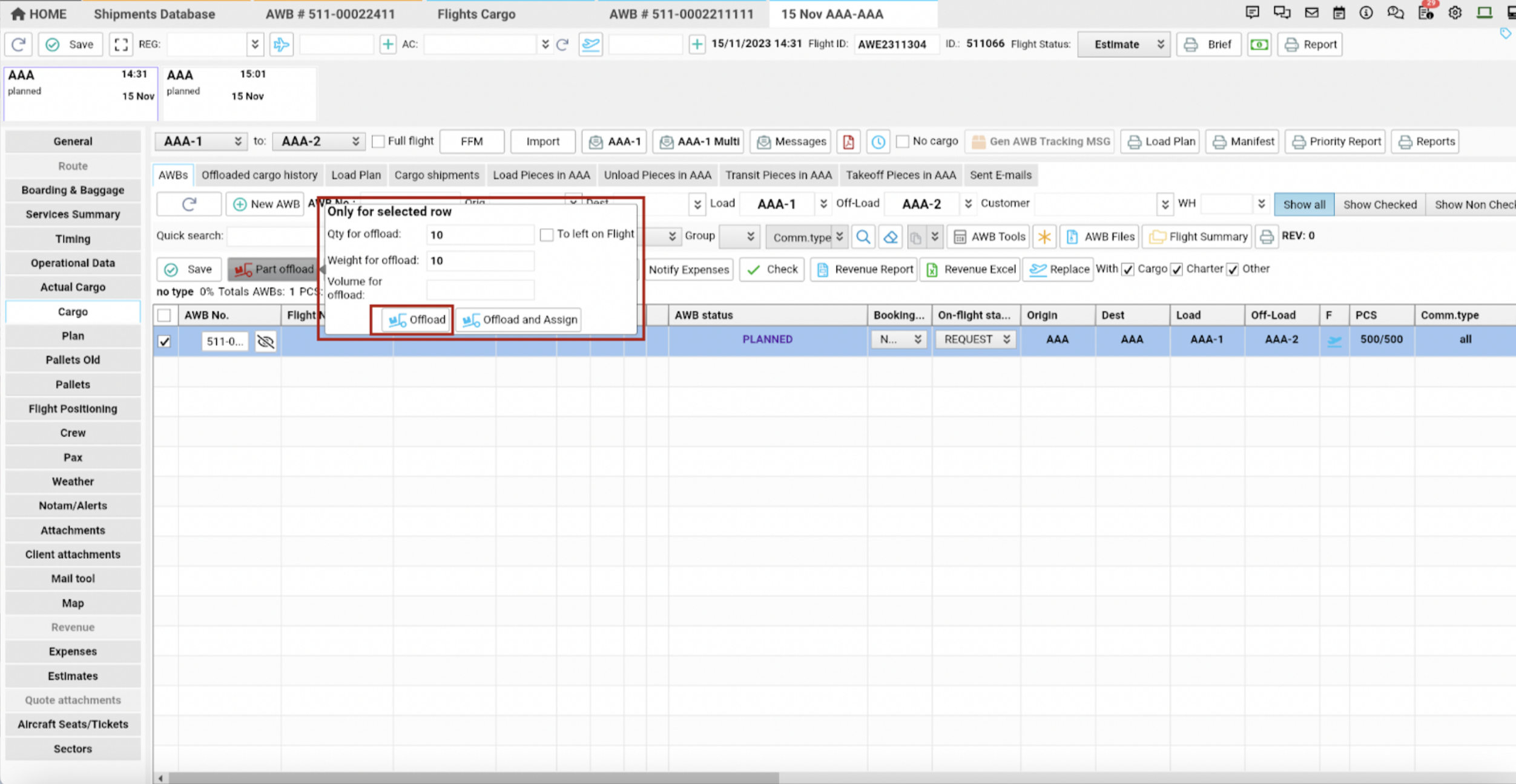 - If you do not select the to leave on flight option, the amount specified in the Qty for offload will be separated from the existing units on the flight after clicking the Offloaded button.