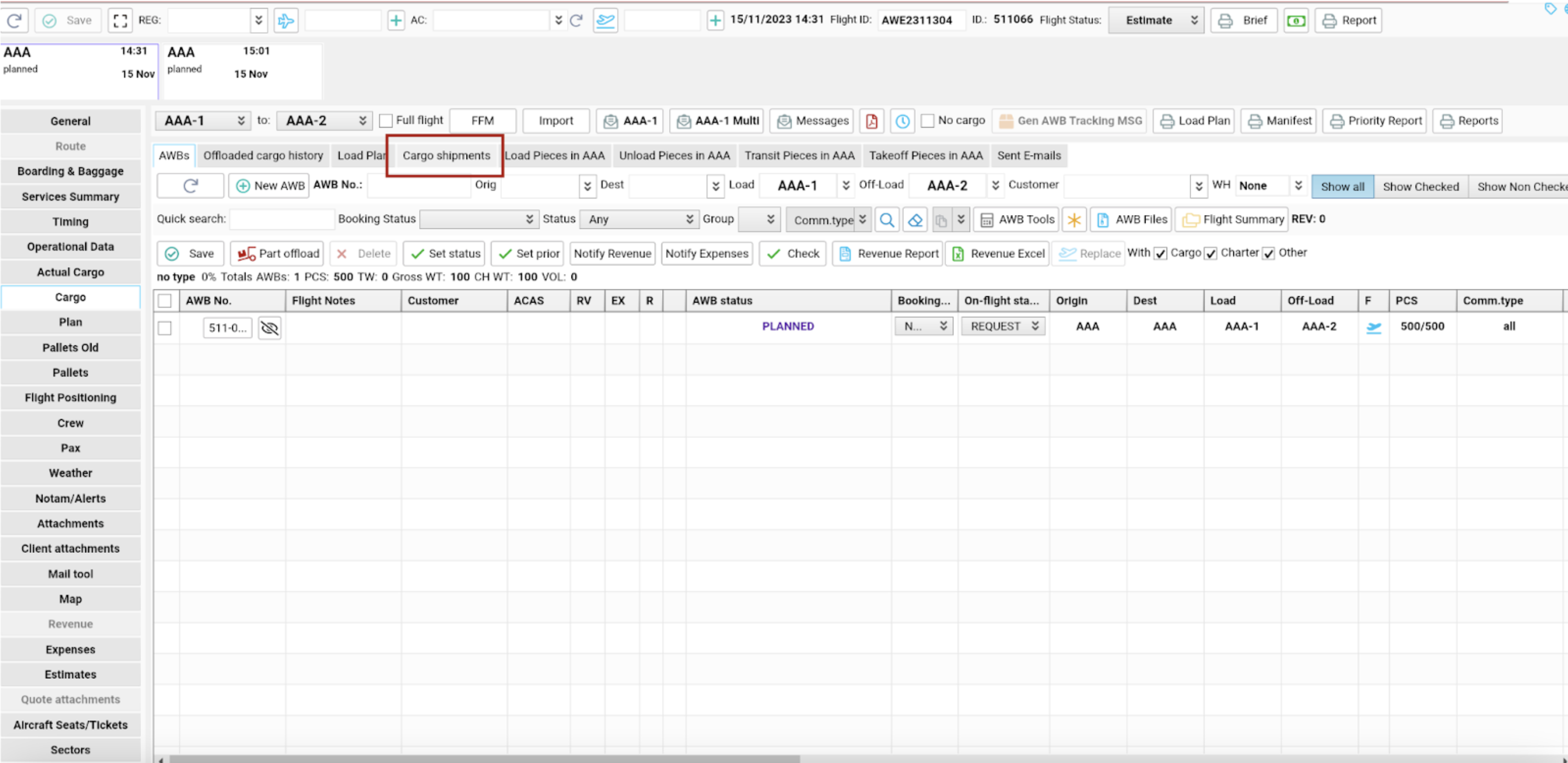 Path: Home → Shipments Database → choose AWB → tab Routing → open flight → tab Cargo → Cargo Shipments