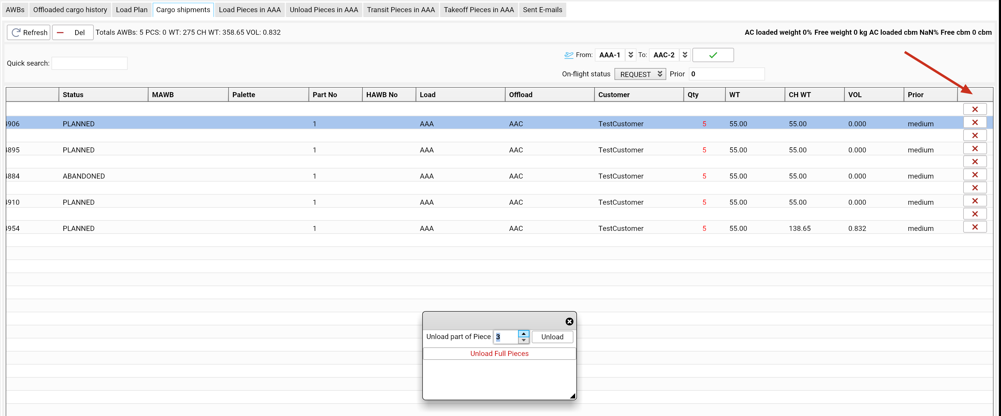 Form will appear on the screen where you have to specify how much you want to remove from this flight and click Unload, after what the system will remove the specified number of pieces from the flight.